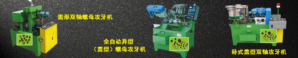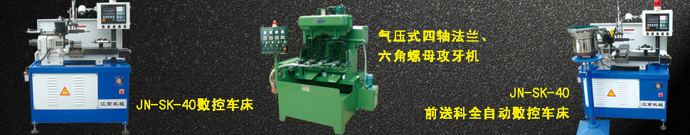 产品主要有: 全自动异型(盖型)双轴螺母攻牙机,全自动异型(盖型)螺母攻牙机,双轴圆形螺母攻牙机, 内膨胀双轴攻牙机,多功能八轴螺母攻牙机,全自动前送料数控车床,JN-SK-40前送料全自动数控车床,JN-SK-40数控车床,卧式盖型双轴攻牙机,气压式双轴攻牙机,四轴六角(法兰)攻牙机,气压式四轴法兰、六角螺母攻牙机,齿轮式螺母攻牙机,六轴立式攻牙机,JN-16三轴全自动全牙机,JN-双轴长螺母攻牙机,转盘半自动立式12轴螺母攻牙机等螺母攻牙设备。本厂坚持以人为本,以市场为导向,加强管理,不断进行技术创新,产品的研究开发,为广大用户提供优质的产品和热情周到的服务。